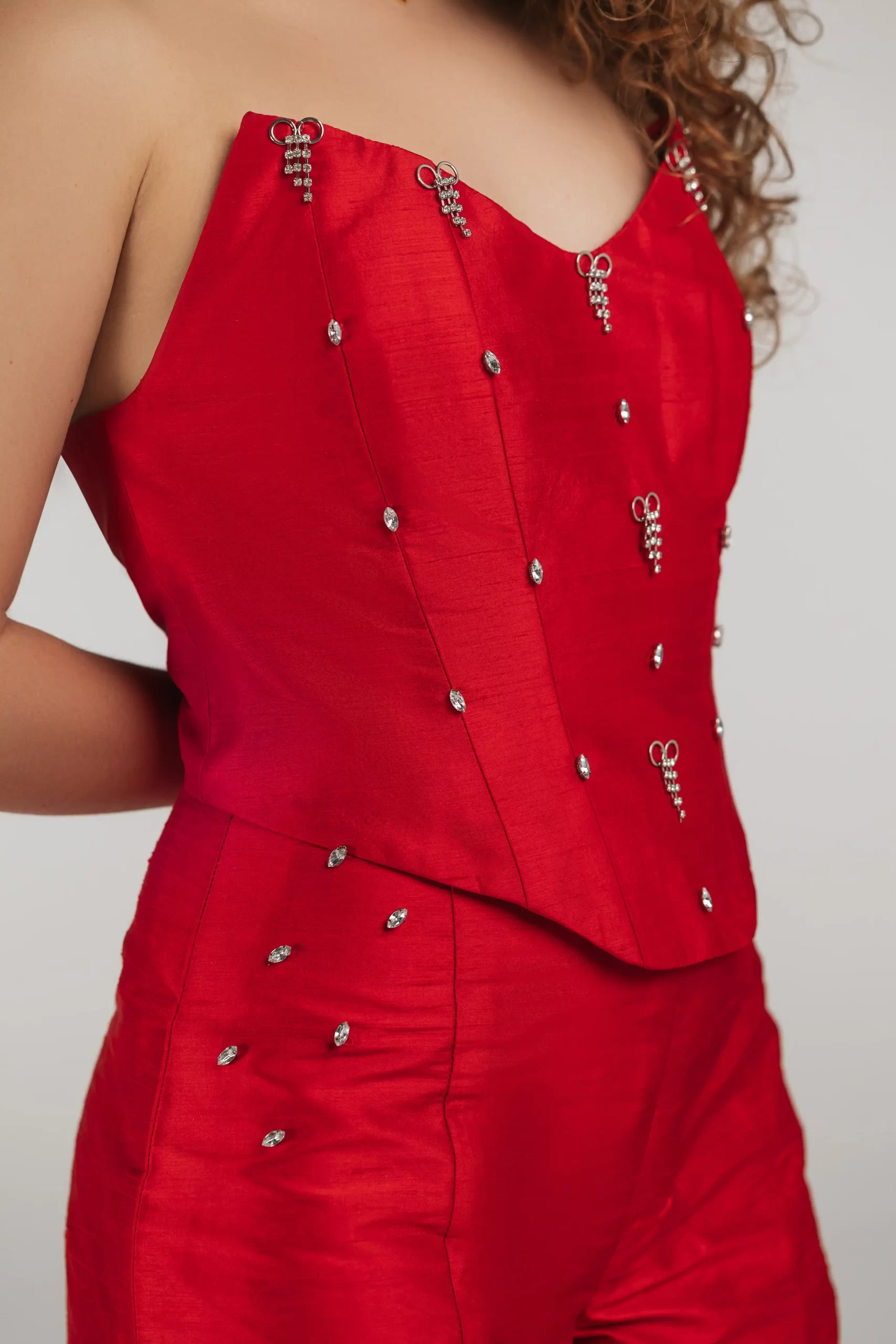 Corset: Semi-Sweetheart Neckline, Fitted, Corset, Hand Embroidery with beads, centre back Hook and Eye Closure, Lining.